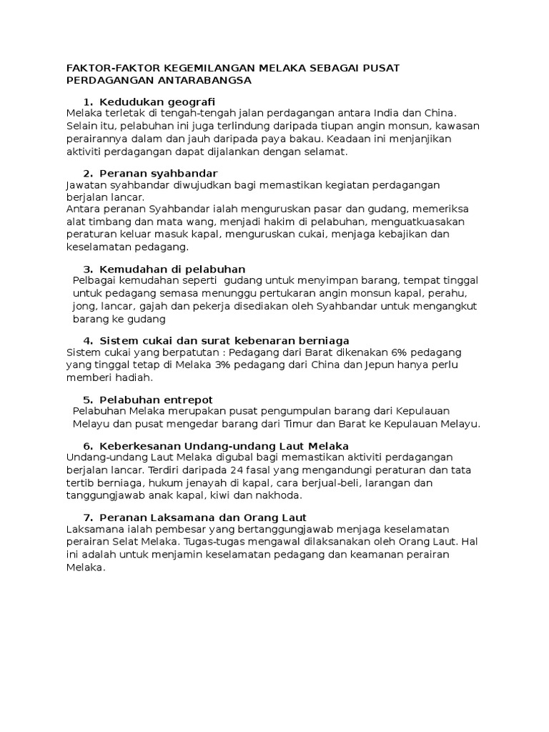Sej t2 kssm bab 5.2 : L kemunculan melaka sebagai sebuah kerajaan agung dipengaruhi oleh beberapa faktor iaitu: Faktor perdagangan tersebut menyebabkan melaka munculs ebagai sebuat pelabuhan entrepot (pusat perdagangan yang biasanya menjadi tempat menngimport dan mengeksport semula barang dagangan. 5.2 faktor kegemilangan kesultanan melayu melaka. Faktor kegemilangan kesultanan kerajaan melaka.