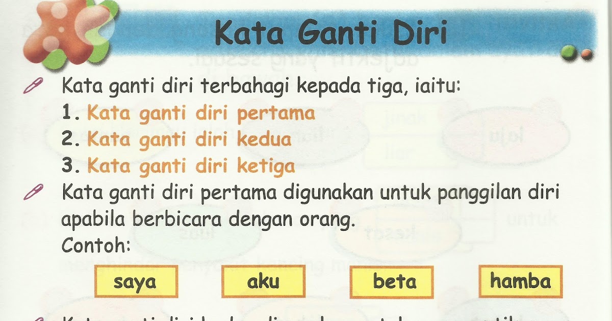 Kata ganti nama diri pertama. Bentuk penggunaan contoh ayat tunggal ia digunakan untuk merujuk benda atau haiwan yang diperkatakan 1. 99653906 panduan guru bahasa malaysia sk tahun 3. Cara mengajarkan perkataan berdasarkan pendekatan tradisional. Kata ganti nama diri ketiga. Pasif boleh dibahagikan kepada tiga kategori utama iaitu ayat pasif dengan kata ganti kata kena nama diri kata ganti nama diri pertama pdf document Kata ganti nama diri pertama. Kata ganti nama diri ketiga kata ganti nama diri ketiga digunakan untuk merujuk orang yang diperkatakan. Kata ganti nama diri kedua (pendengar) c. Blog cikgu aini kata ganti nama. Digunakan apabila bercakap dengan seseorang yang baru dikenali atau dalam suasana rasmi. Kata ganti nama diri ketiga in english. Kata bantu seperti akan sedang dsb.